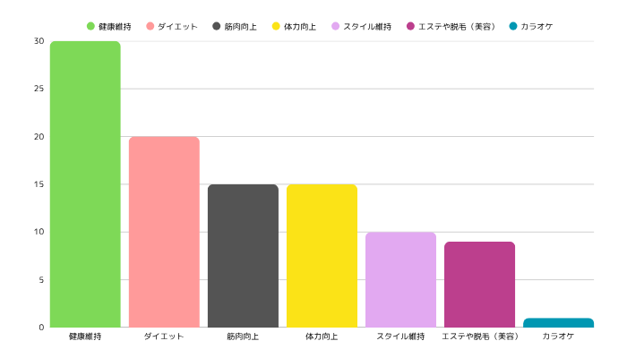 振り分けとしてはどれも似たり寄ったりな感じですが、ざっくり言えば「健康維持」と「スタイル維持」がメインとなっていました。利用者も初心者が多いことから、筋肉を本気で育てたい人も少ないので、筋肉や体力向上といったハードなユーザーも少なめです。