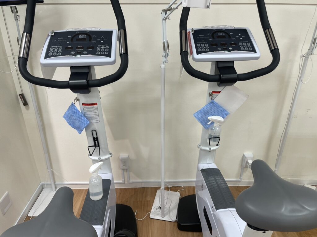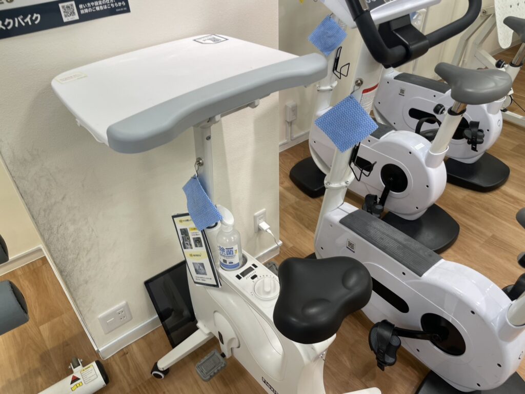 通常のエアロバイクに作業台が設置されており、作業しながら運動できるマシンです。