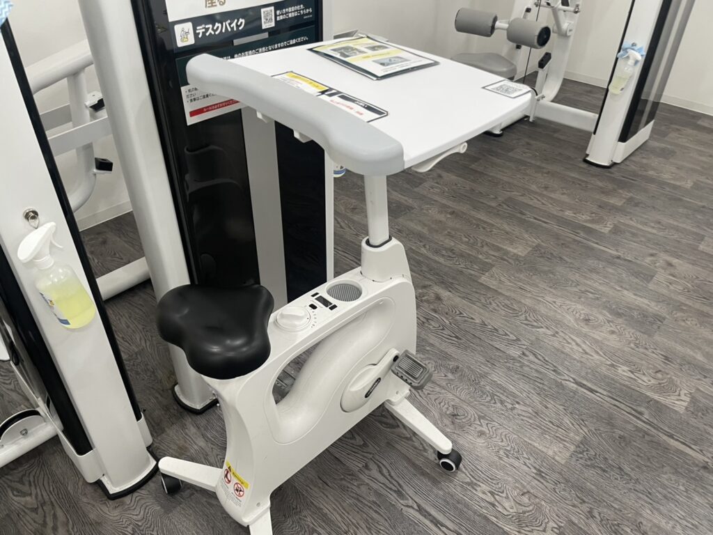 通常のエアロバイクに作業台が設置されており、作業しながら運動できるマシンです。